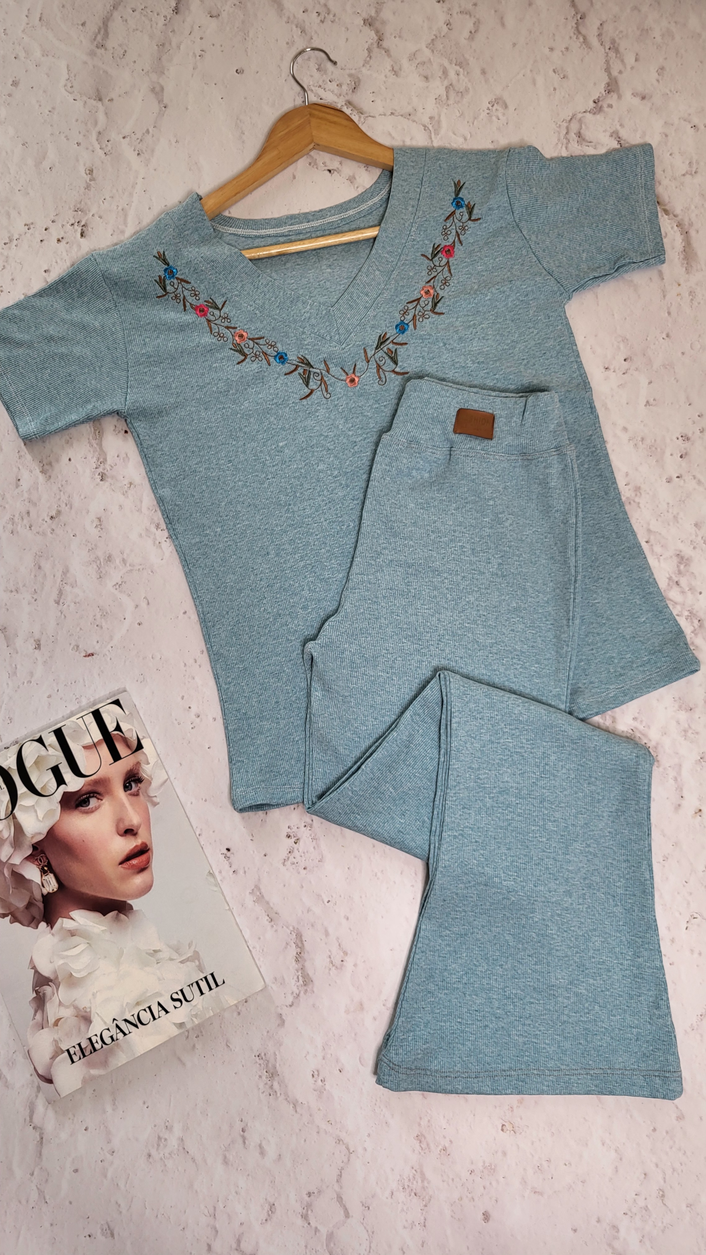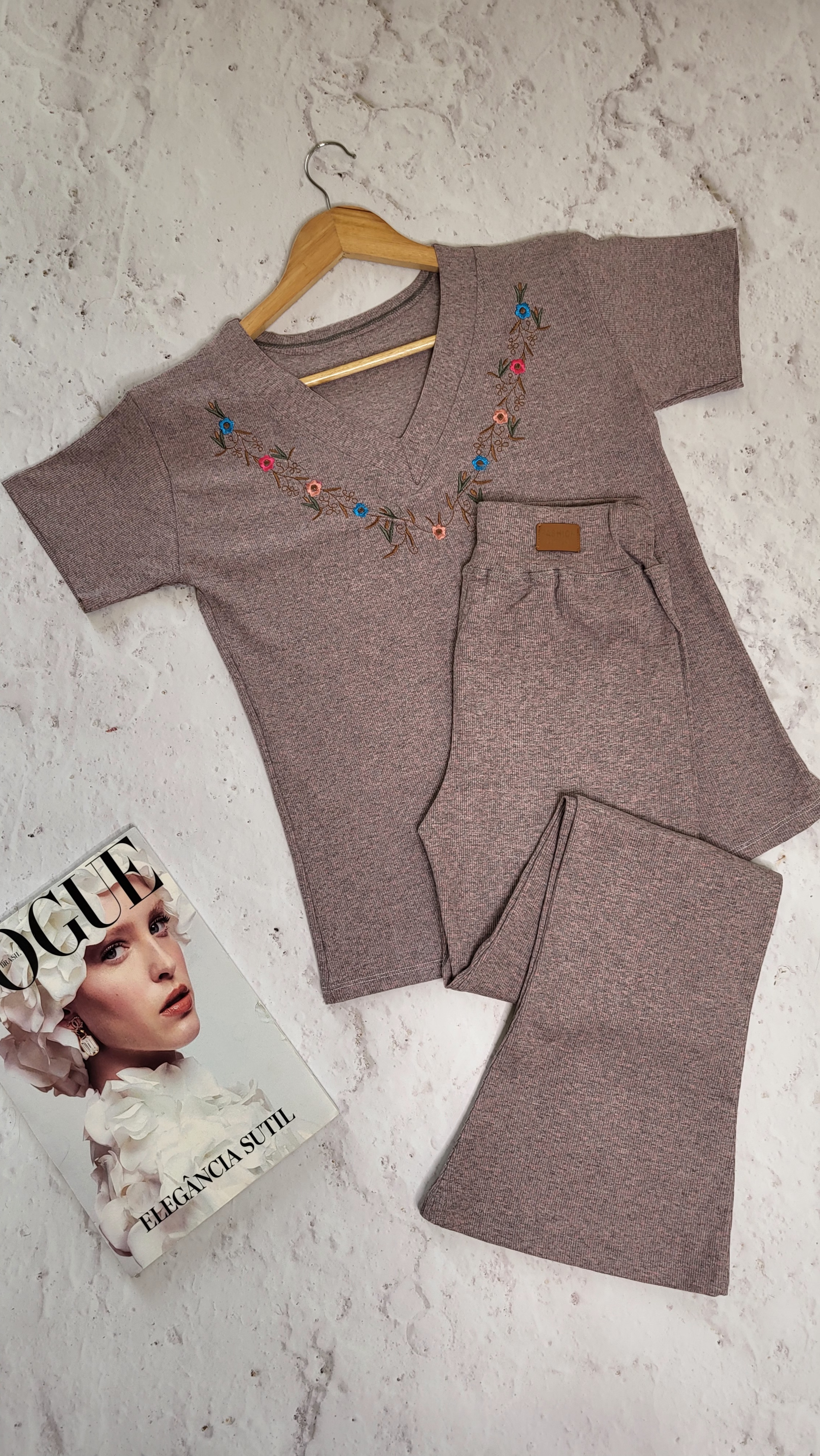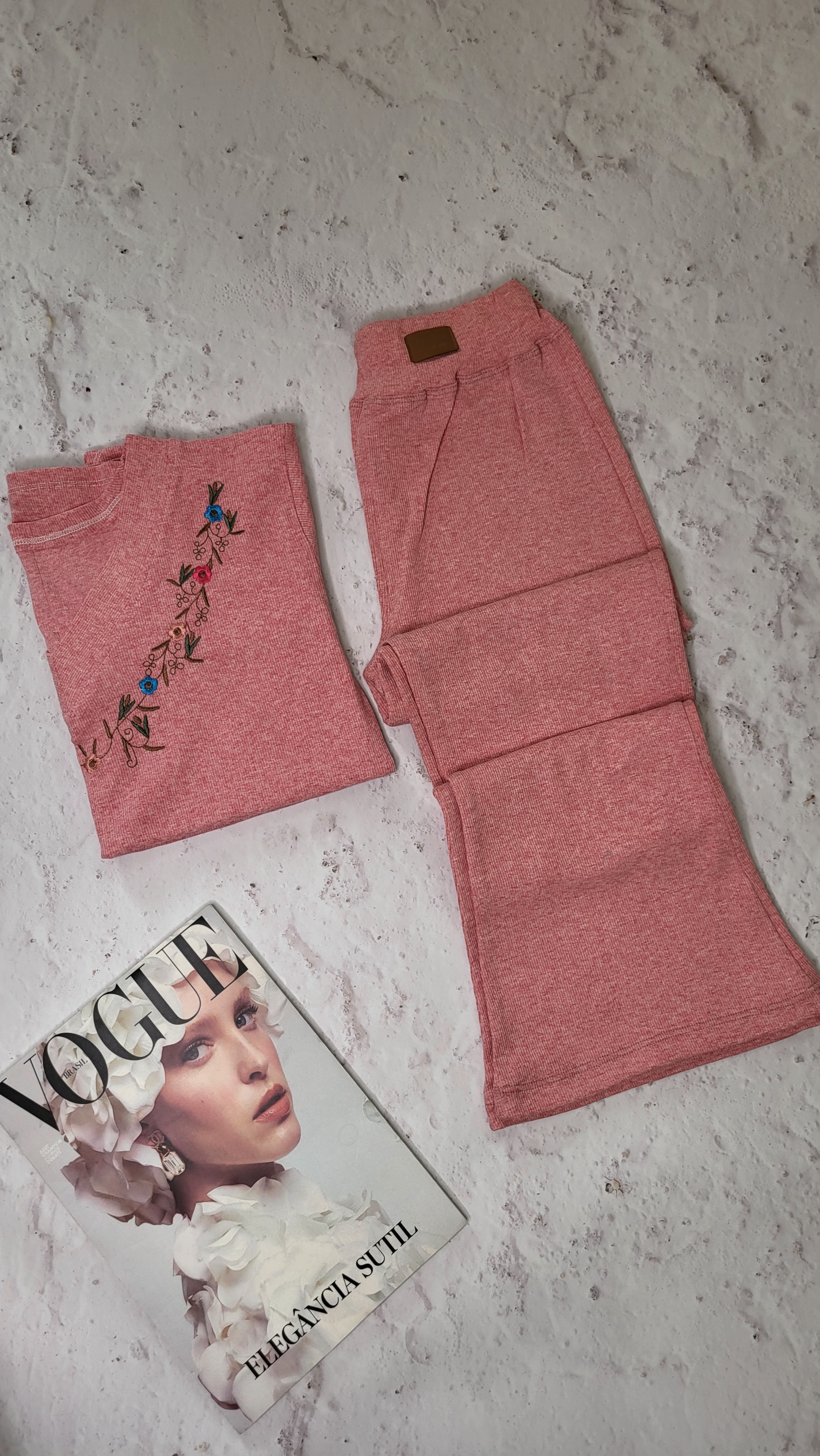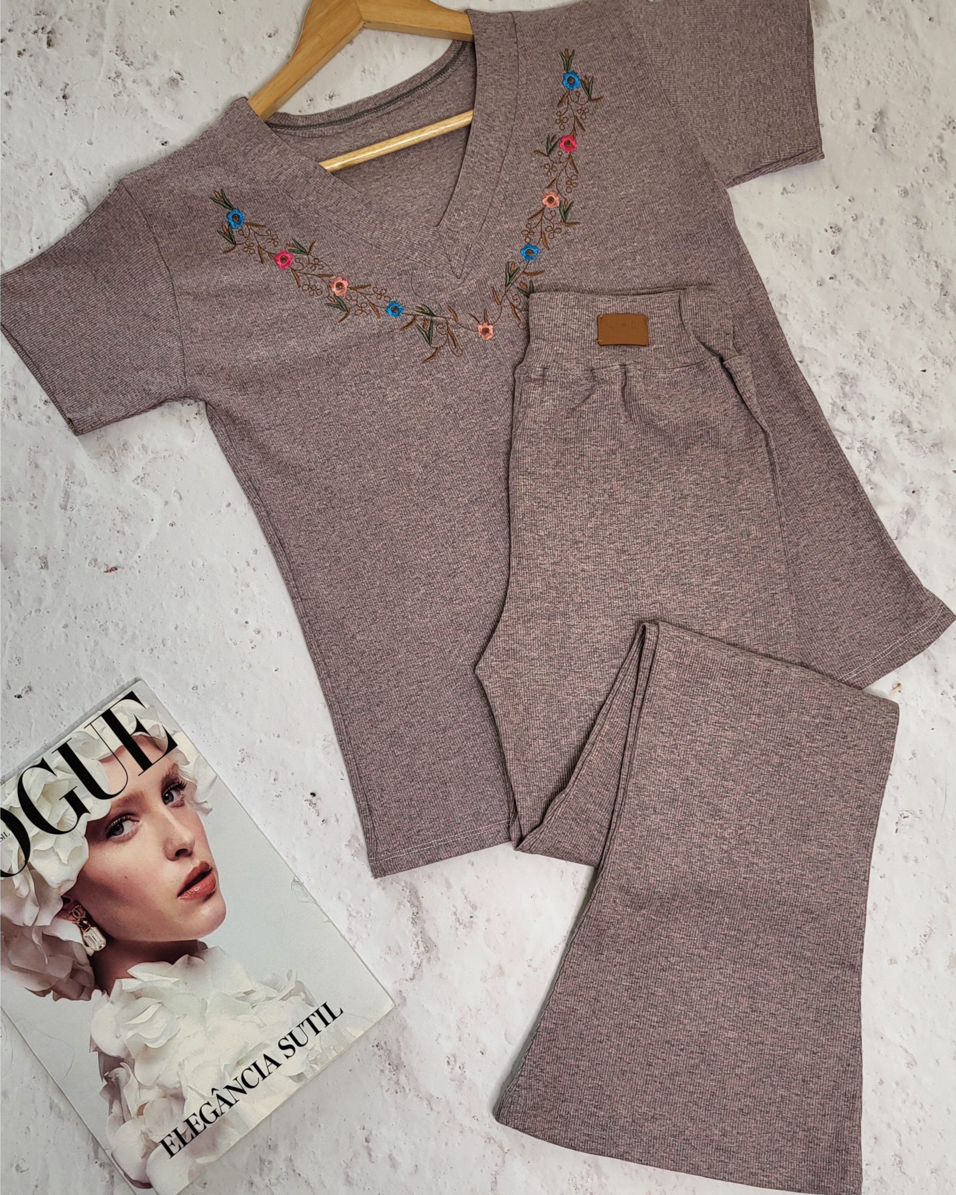 ست تیشرت و شلوار گلدوزی با جنس کبریتی درجه یک و دارای کشسانی. فری سایز تا ۴۸. قد شلوار ۱۰۲ و قد تیشرت ۶۷.